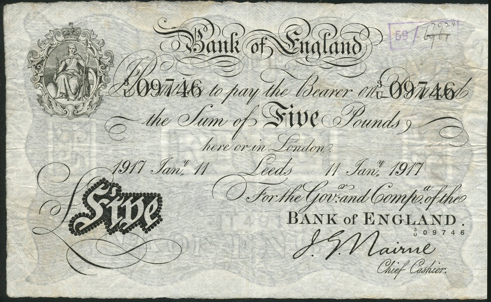 Bank of England, J.G.Nairne, £5, Leeds, 11 January 1917, serial number 3/U 09746, black and white, ornate crowned vignette of Britannia top left, value in black tablet low left