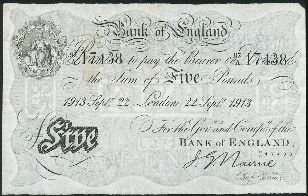 Bank of England, J.G. Nairne, £5, London, 22 September 1913, serial number 97/A 17438, ornate crowned vignette of Britannia at top left, value in black tablet at low left