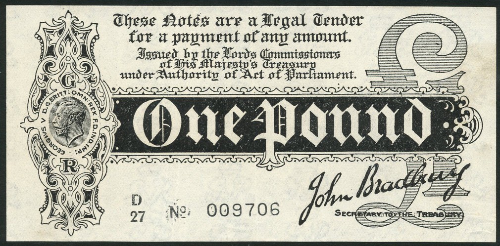 Treasury series, John Bradbury, £1, ND (7 August 1914), serial number D/27 009706 (dash), black and white, George V at left, value in black tablet at centre
