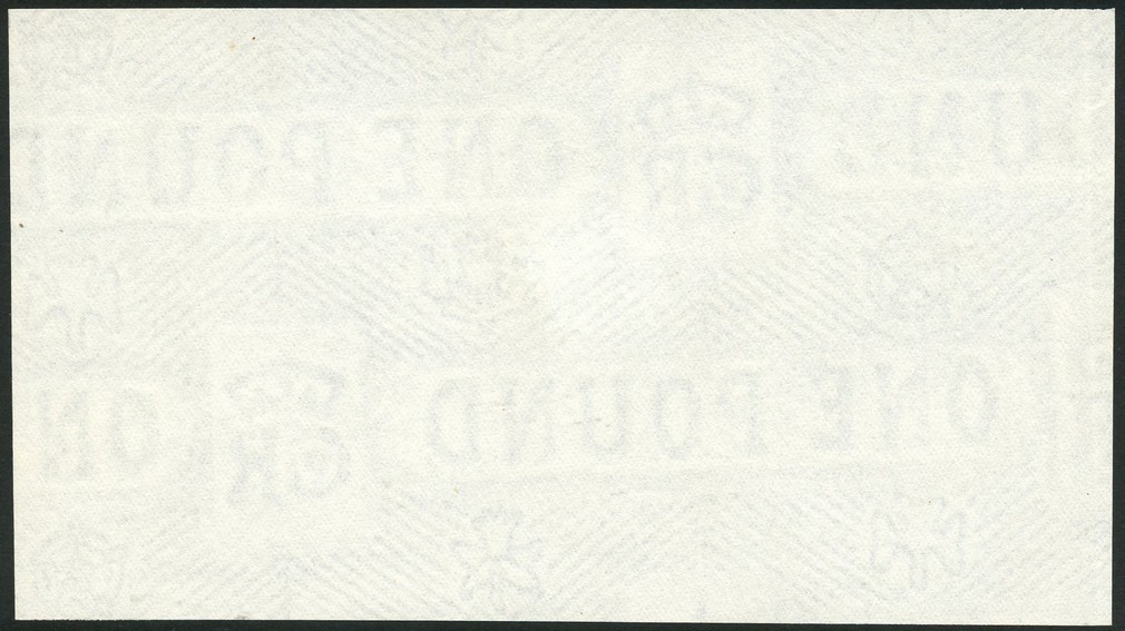 Treasury watermarked paper, manufactured by William Joyson & co with multiple watermark of Vandyck diagonal lines, incorporating the Roya Cypher, the denominaiton ONE POUND and the four British emblems