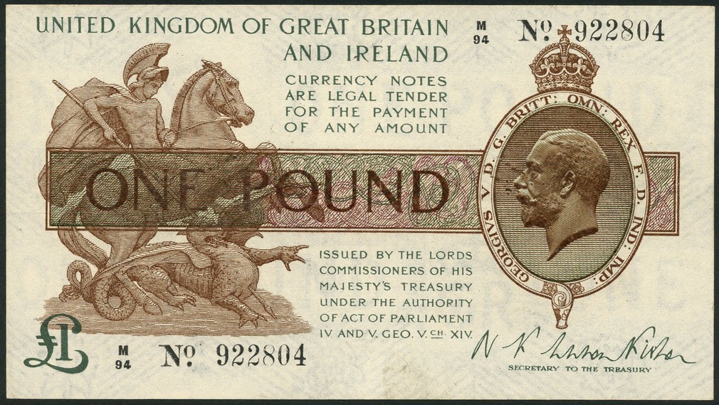 Treasury series, N.F. Warren Fisher, £1, ND (30 September 1919), serial number M/94 922804 brown, purple and green, King George V at right, Saint George and the dragon at left, value at low left and in ornate tablet at centre, reverse brown, the Houses of Parliament