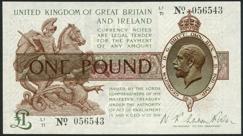 Treasury Series, N.F.Warren-Fisher, £1 (2), ND (1919/1923), prefix U/6, L1/71, brown, purple and green, crowned head of George V at right, Saint George and the dragon at left