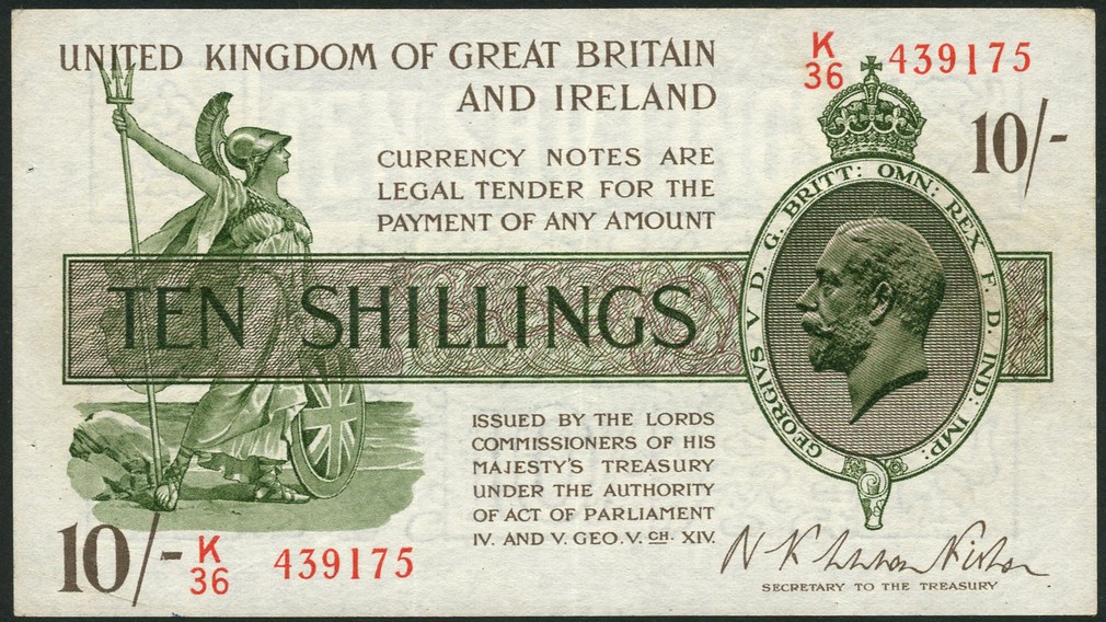 Treasury Series, N. F. Warren Fisher, 10 shillings (2), ND (6 November 1922), serial numbers K36 439175 and M56 686477, green, white and lilac, portrait King George V at left, Britannia at left