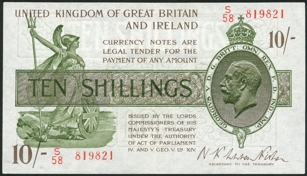 Treasury series, N.F. Warren Fisher, 10 shillings, ND (6 November 1923), red serial number S/58 819821, green, white and lilac, Britannia at left, crowned head of King George V at right