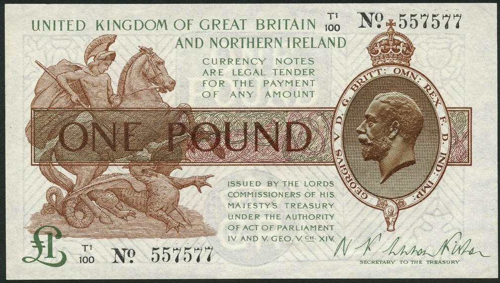 Treasury Series, N.F.Warren-Fisher, £1, ND (1927), serial number T1/100 557577, brown, purple and green, crowned head of George V at right, Saint George and the dragon at left, NORTHERN IRELAND type