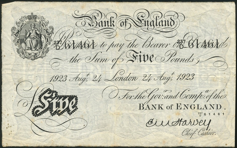 Bank of England, E.M.Harvey, £5, London, 24 August 1923, serial number 237/D 61461, black and white, ornate crowned vignette of Britannia at top left, value in black tablet at low left