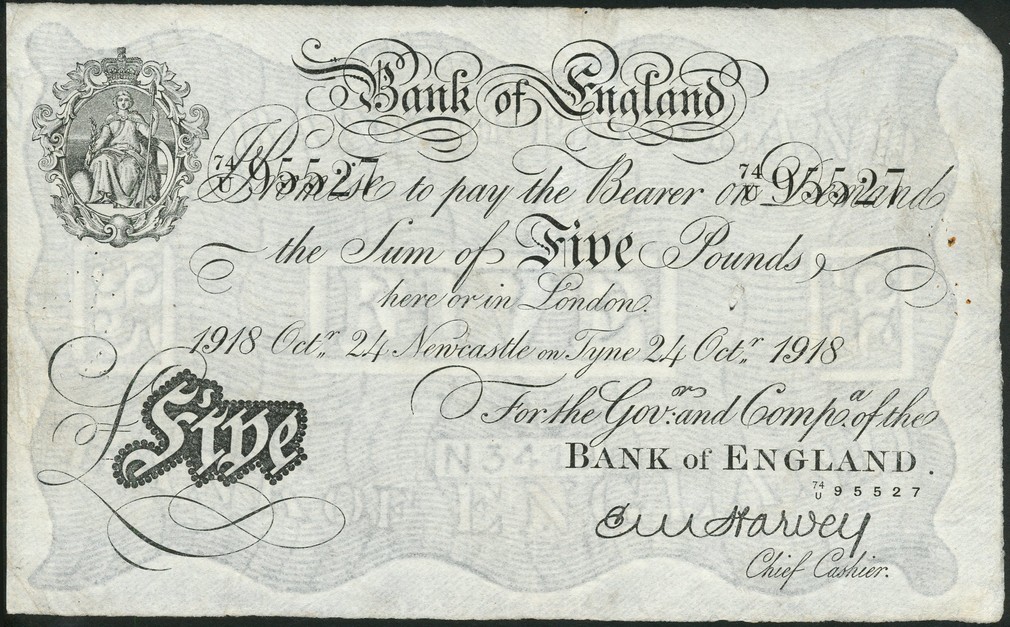 Bank of England, E.M.Harvey, £5, Newcastle on Tyne, 24 October 1918, serial number 74/U95527, black and white, ornate crowned vignette of Britannia top left, value in black tablet low left