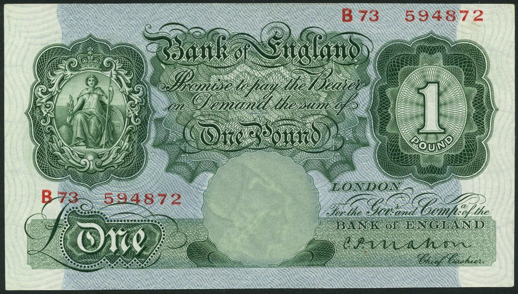 Bank of England, C.P. Mahon, 10 shillings and £1, serial numbers Y89 383601 and B73 594872, both have Britannia at left, value at right, brown and green respectively
