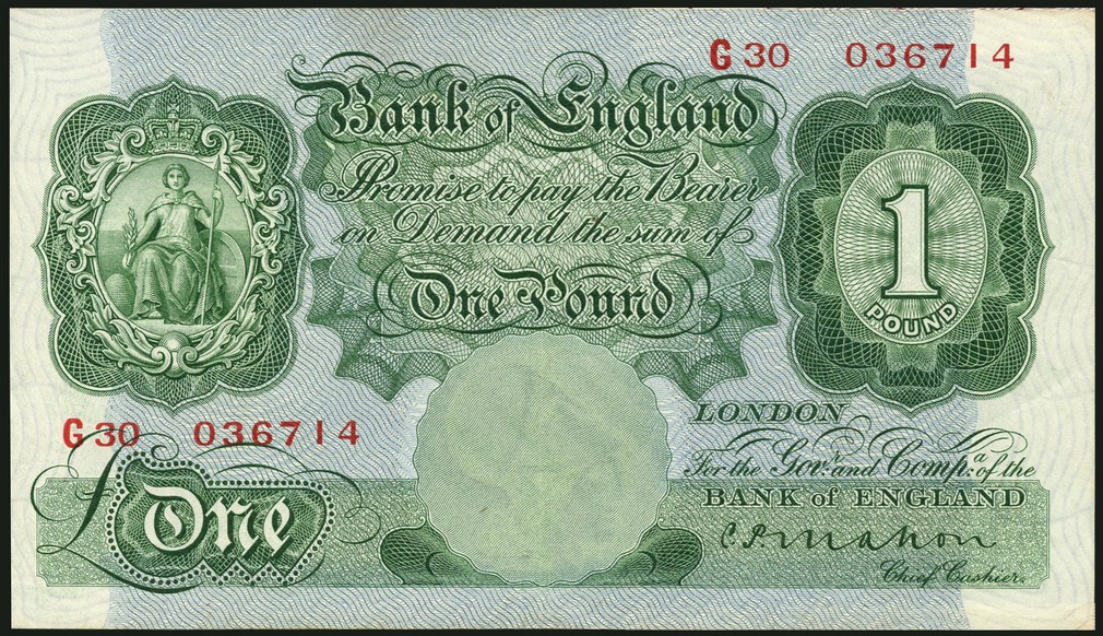 Bank of England, C.P.Mahon, 10/-, ND (1928), serial number Z11 619855, red, also £1, ND (1928), serial number G30 036714, green, also B.G.Catterns, 10/-, ND (1930), serial number R78 365834, red and £1, ND (1930), serial number J14 252987, green, all with Britannia at left, value at low left and top right,