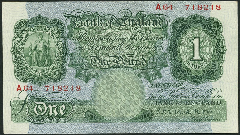 Bank of England, C.P.Mahon, £1 (7), ND (1928), prefixes A,B,C,D,E,F,G, green, crowned vignette of Britannia at left, value at right