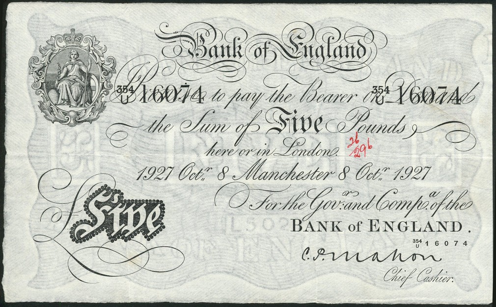 Bank of England, C.P.Mahon, £5, Manchester, 8 October 1927, serial number 354/U 16074, black and white, ornate crowned vignette of Britannia top left, value in black tablet low left