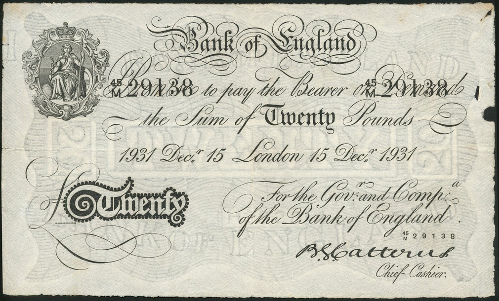 Operation Bernhard, B.G. Catterns, £10, London, 19 February 1932, serial number K/102 71520, and £20, London, 1931 December 1915, serial number 45/M 29138, black and white, ornate crowned vignette of Britannia at top left, value in black tablet at low left,