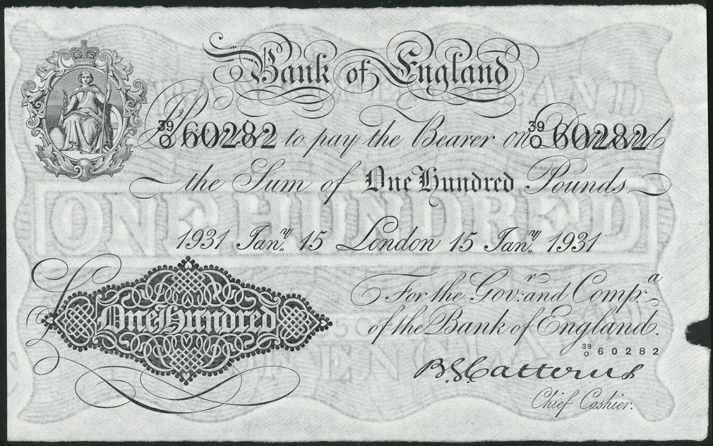 Bank of England, B.G.Catterns, £100, London, 15 January 1931, serial number 39/O 60282, black and white, ornate crowned vignette of Britannia at top left, value in black tablet at low left
