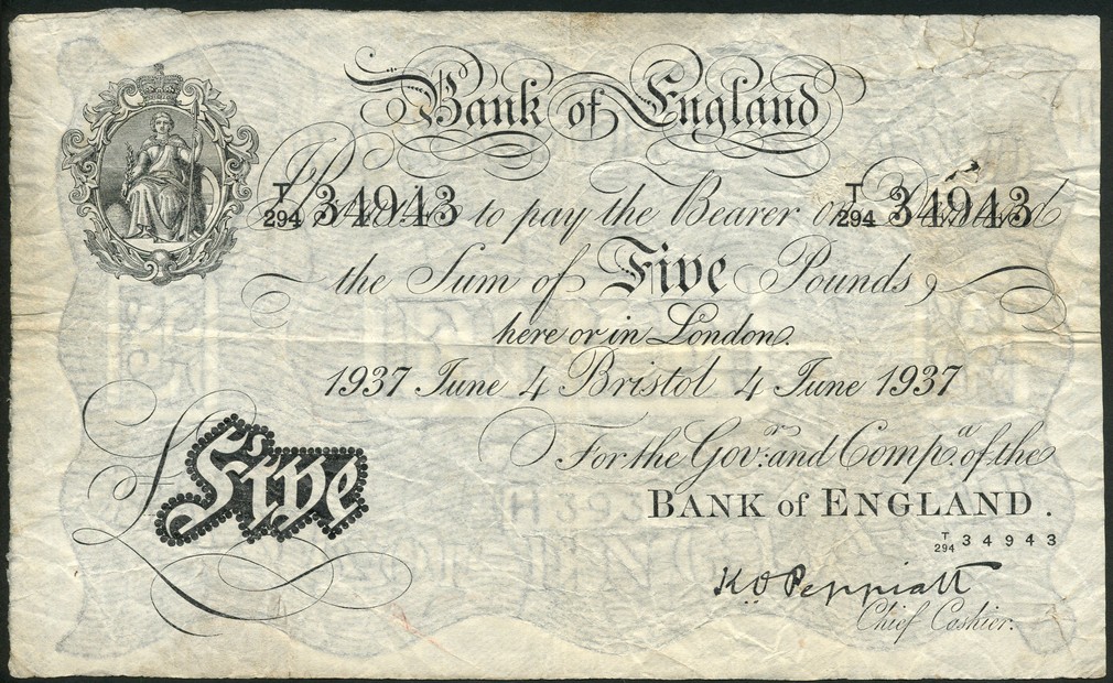 Bank of England, K.O.Peppiatt, £5, Bristol, 4 June 1937, serial number T/294 34943, black and white, ornate crowned vignette of Britannia top left, value in black tablet low left