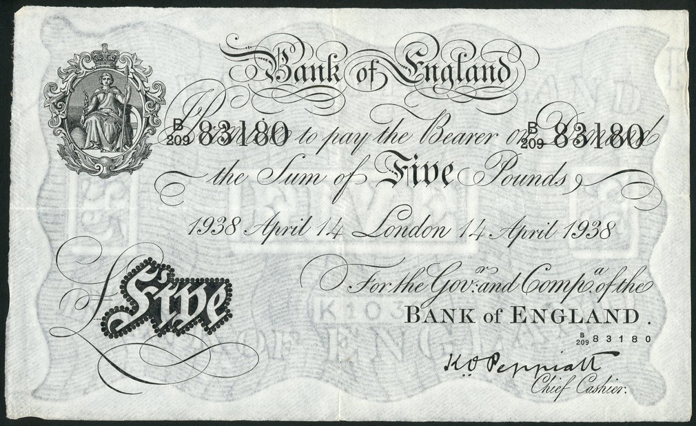 Bank of England, K.O.Peppiatt, £5, London, 14 April 1938, serial number B/209 83180, black and white, crowned vignette of Britannia top left, value in black tablet low left