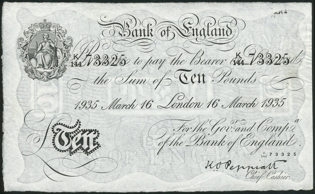 Bank of England, K.O.Peppiatt, £10, London, 16 March 1935, serial number K/144 73325, ornate crowned vignette of Britannia at top left, value in black tablet at low left