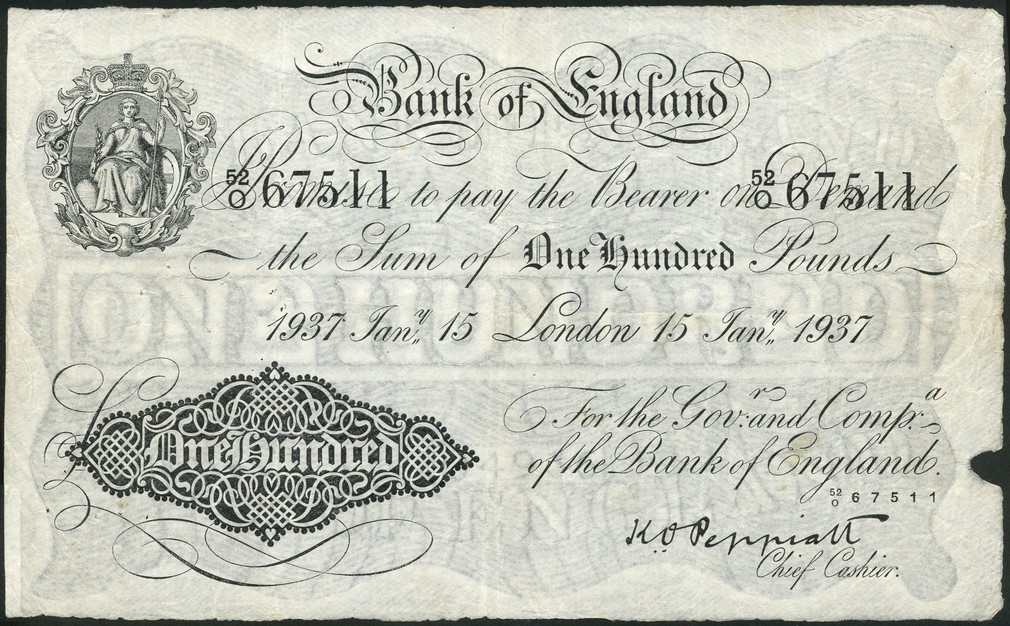 Bank of England, K.O.Peppiatt, £100, 15 January 1937, serial number 52/O 67511, black and white, ornate crowned vignette of Britannia at top left, value in black tablet at low left