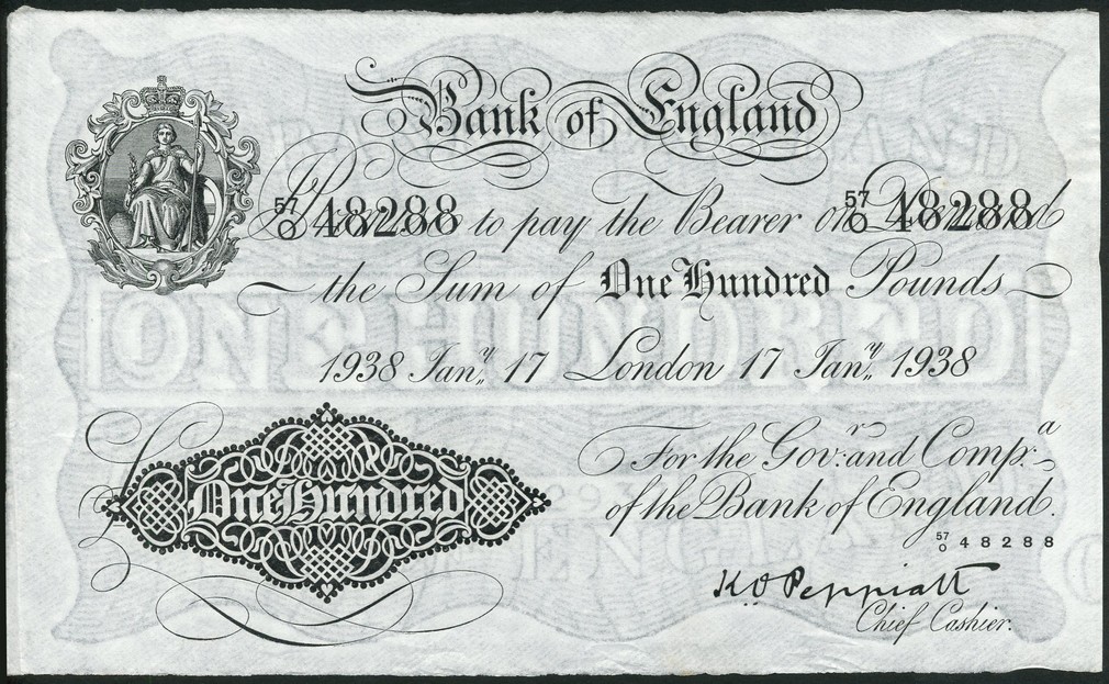 Bank of England, K.O.Peppiatt, £100, London, 17 January 1938, serial number 57/O 48288, black and white, ornate crowned vignette of Britannia top left, value in black tablet low left