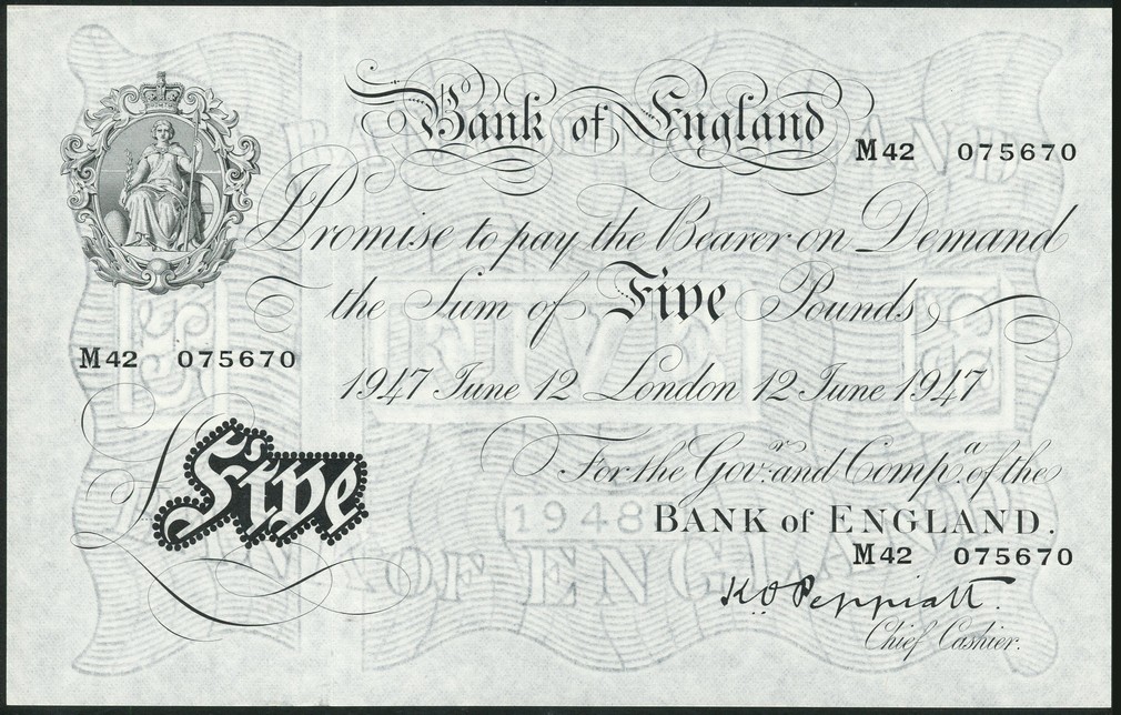 Bank of England, K.O.Peppiatt, £5, London, 12 June 1947, serial numbers M42 075670, black and white, ornate crowned vignette of Britannia at top left, value in black tablet at low left