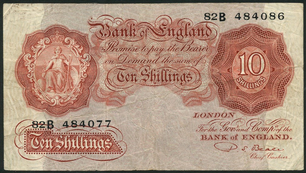 ERROR: Bank of England, P. S. Beale, 10 shillings, ND (1950), mismatched serial numbers 82B 484086 and 82B 484077, reddish brown, seated Britannia at left, bank title top centre, value low left, centre and top right,