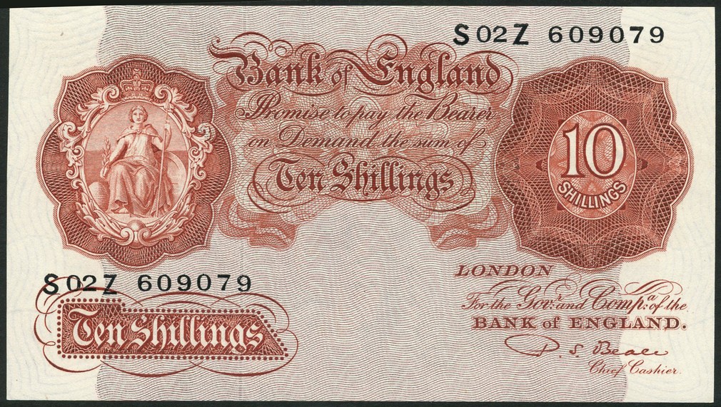 Bank of England, P. S. Beale, 10 shillings (2), ND (1950), consecutive serial numbers S02Z 609079/80, Britannia at left, also J. Q. Hollom, 10 shillings (2), ND (1963), consecutive serial numbers NN43 949908/9, plus J. S. Forde, 10 shillings (3), consecutive serial numbers 61Y712932/4