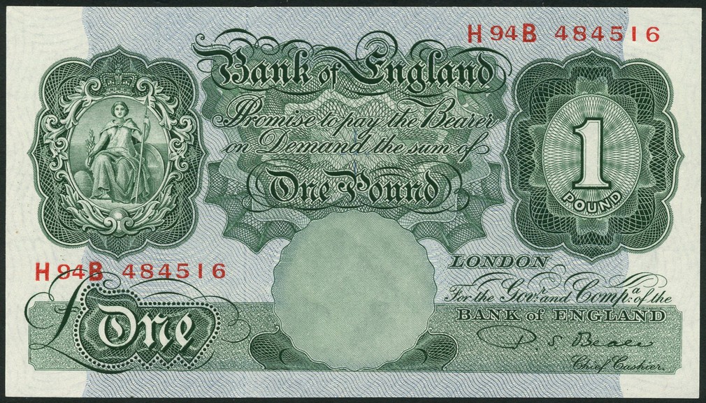 Bank of England, P. S. Beale, £1 (7), ND (17 March 1950), consecutive serial numbers H94B 484516/22, green, seated Britannia at left, bank title top centre, value low left, centre and right, St George slaying dragon at left and right