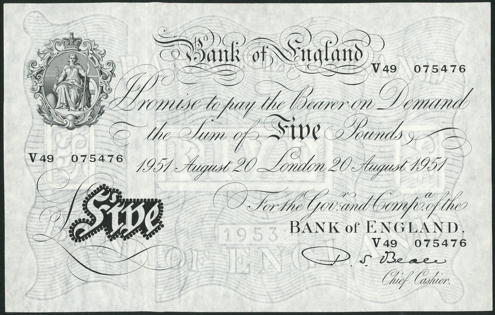 Bank of England, P.S. Beale, £5, London, 20 August 1951, serial number V49 075476, black and white, ornate crowned vignette of Britannia top left, value in tablet low left