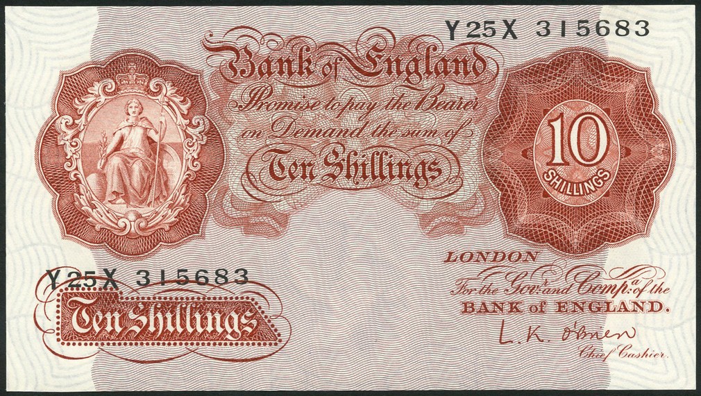 Bank of England, L.K.O'Brien, 10/- (2), ND (1955), serial numbers Y25X 31583-84, red, Britannia at left, value at top right and in tablet at low left