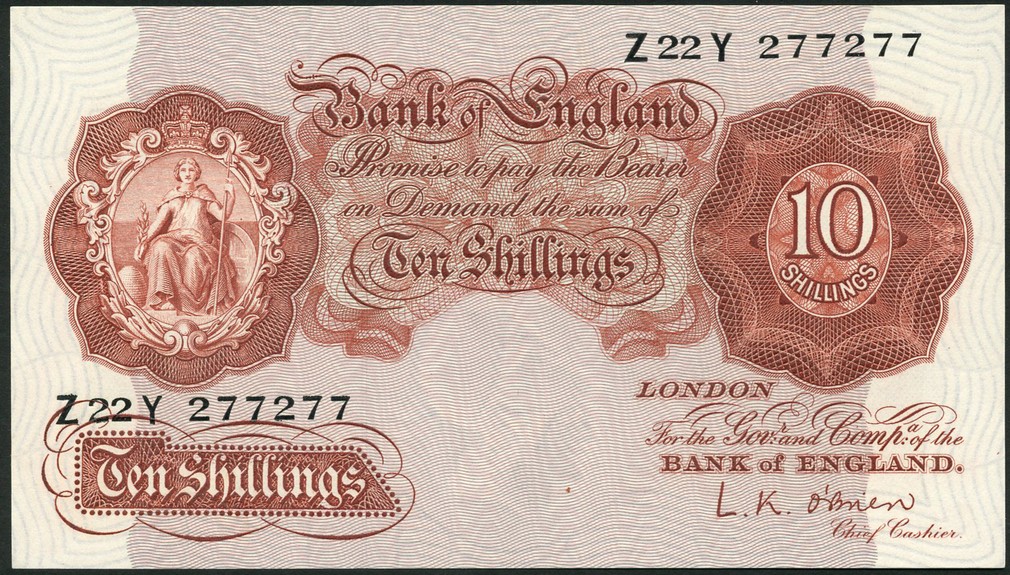Bank of England, L.K.O'Brien, 10/- (20), ND (1955), prefixes Z,Y,X,W,U,T,S,R,O,N,M,L,K,J,H,E,D,C,B,A, all suffix Y, brown, crowned vignette of Britannia at left, value at right