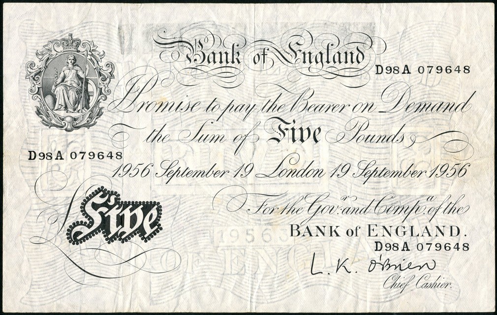 Bank of England, L.K.O'Brien, £5, London, 19 September 1956, serial number D98A 079648, black and white, ornate crowned vignette of Britannia top left, value in black tablet low left