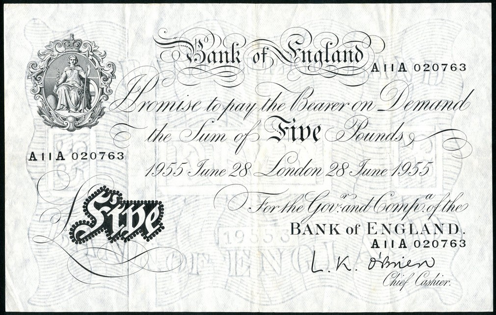 Bank of England, L.K. O' Brien, £5, ND (1957), prefixes E29, H88 and ND (1961), prefixes H86, H88, J31, K18, blue on multicoloured underprint, Britannia at left, £5 London 28 June 1955, prefix A11A and £1, ND (1960) prefix A61 (3)