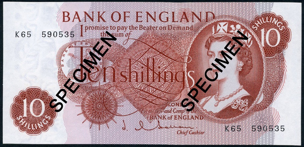 Bank of England, J.Q.Hollom, 10/-, ND (1963), serial number K65 590535, red, Elizabeth II at right, value at centre, low left and top right, reverse Britannia at centre