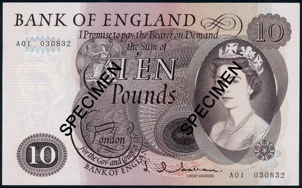 Bank of England, J. Q. Hollom, £10, ND (1964), serial number A01 030832, first run, brown on multicolour, portrait Queen Elizabeth II at right, seated Britannia top centre left, reverse, bank title, lion and key at centre, denomination low left and top right