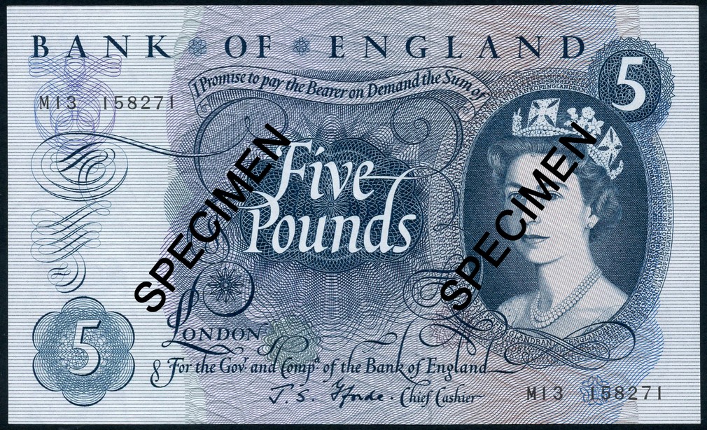 Bank of England, J.S.Fforde, £5, ND (1967), serial number M13 158271, blue on brown and green underprint, Elizabeth II at right, value at centre, top right and low left, reverse Britannia,