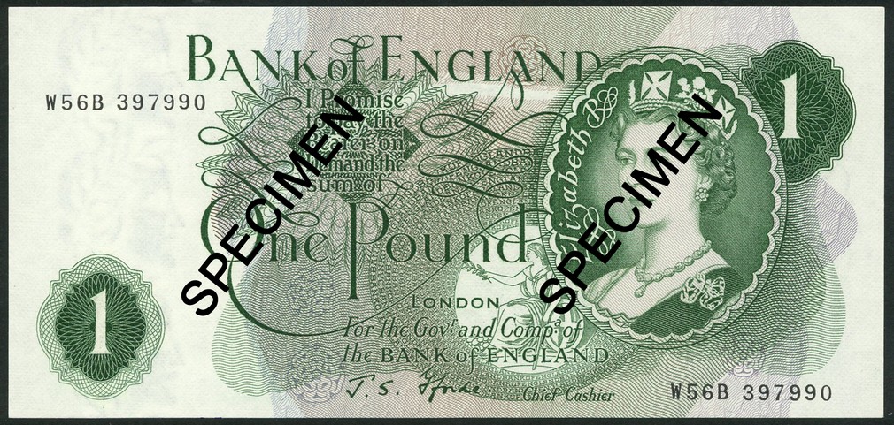 Bank of England, a Page Fforde signature sequence pair, £1 (2), ND (1967), serial numbers W56B 397990 (Fforde) and W56B 397991 (Page), green, Elizabeth II at right, Britannia at centre