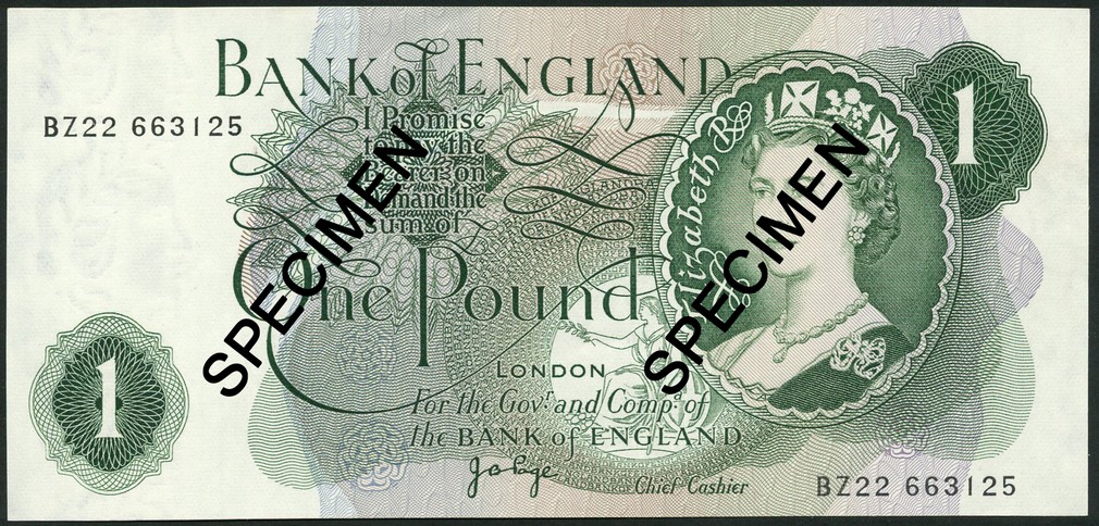 Bank of England, J. B. Page, £1, ND (1970), serial number S89L 033733, first series, green, Queen Elizabeth II at right, bank title top centre, value low left, centre and top right, reverse Britannia, also £1 (4), ND, (1970), serial numbers AN25 885748, BZ22 663125, CO01 824547 and HZ12 075485