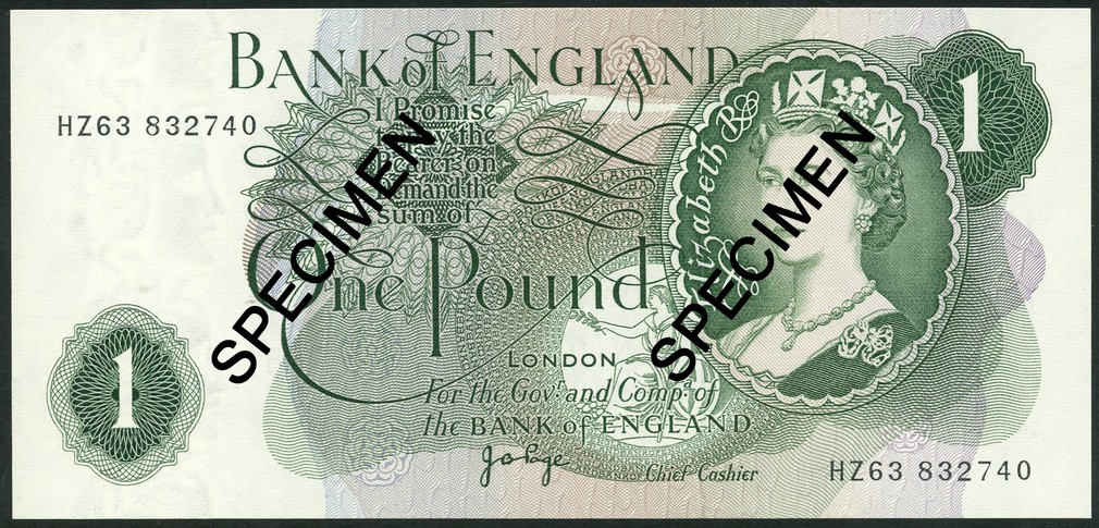 Bank of England, J. B. Page, £1, ND (1970), serial number HZ63 832740, last run, green, Queen Elizabeth II at right, bank title top centre, value low left, centre and top right, reverse, Britannia