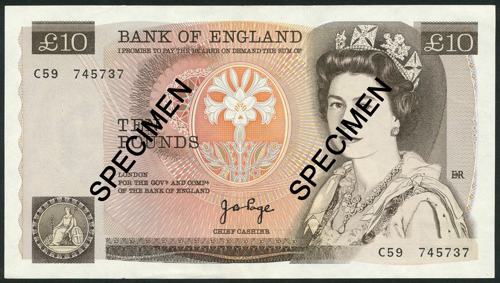 Bank of England, J.B.Page, a group of notes comprising £20, ND (1970), prefix A17, purple, also £1 (4), prefixes CY26, Z64, Z01, and 57J, green, £5, prefix AU18, blue, £10 (2), prefixes B47 and C59, brown, both types