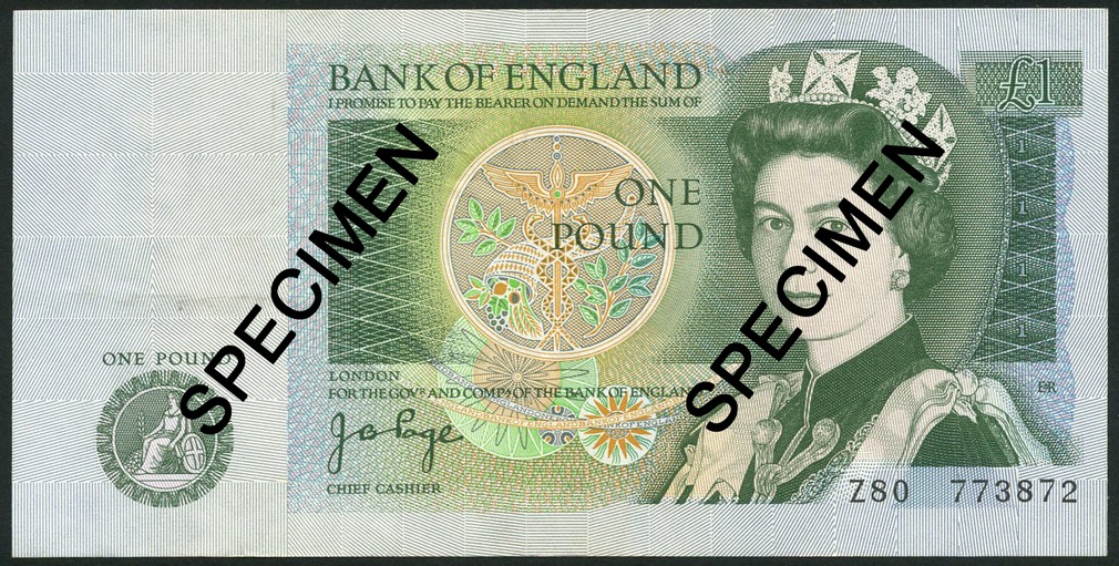 Bank of England, J. B. Page, £1 (5), serial numbers A01 054270, A45 043278, B29 235245, Z03 721412 and Z80 773872, all green and multicolour, Queen Elizabeth II at right, reverse, Sir Isaac Newton centre right