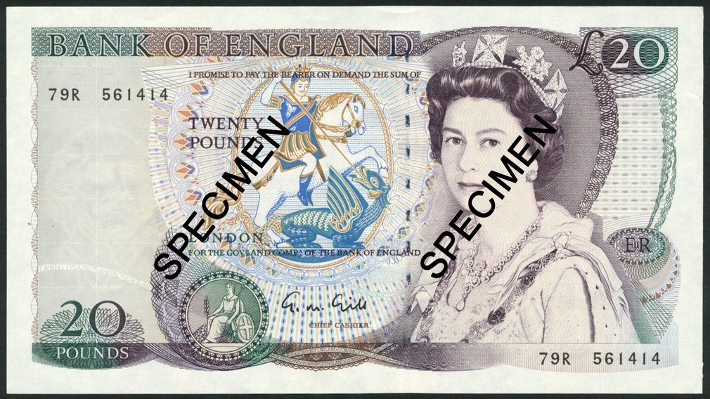 Bank of England, G.M. Gill, a small group comprising £5 (1988), prefix SB24, £10 (1988), prefix EU20, consecutive pair of £20 (1988), prefix 79Ra and £20 (1991, prefix (A01)