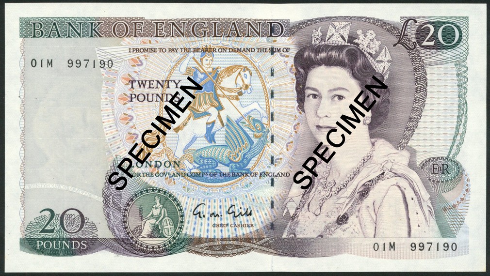 Bank of England, G. M. Gill, £20, ND (1988), serial number 01M 997190, mauve on multicolour, portrait Queen Elizabeth II at right, St George and dragon at centre, seated Britannia low right, reverse, William Shakespeare, Romeo and Juliet top left centre