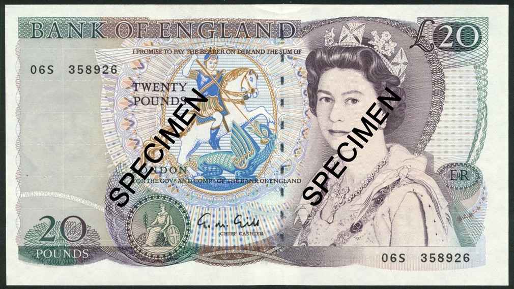 Bank of England, G. M. Gill, £20 (2), ND (1988), consecutive serial numbers 06S 358925/6, mauve on multicolour, portrait Queen Elizabeth II at right, St George and dragon at centre, seated Britannia low right, reverse, William Shakespeare, Romeo and Juliet top left centre