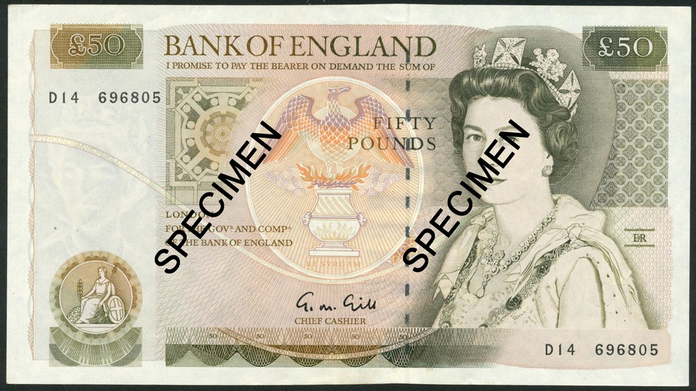 Bank of England, G.M.Gill, £20 and £50, ND (1988), prefixes 19R and D14 respectively, purple and multicolour and brown and multicolour, Elizabeth II at right
