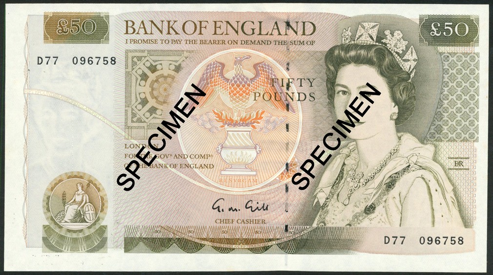 Bank of England, G. M. Gill, £50, ND (1988), serial number D77 096758, olive green on multicolour underprint, portrait Queen Elizabeth II at right, seated Britannia low left, phoenix rising from the flames at centre, reverse, Sir Christopher Wren with St Paul's Cathedral in background