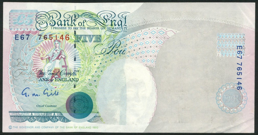 ERROR: Bank of England, G.M. Gill, a consecutive pair of £5, ND (1990), serial number E67 765146/7, blue and green, Queen Elizabeth II at right, reverse blue and multicolour, George Stevenson at right, with whole of right including Queen's portrait and black colouring missing from obverse