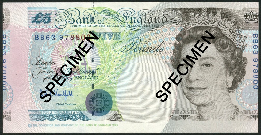 ERROR: Bank of England, G.E.A. Kentfield, £5, ND (1993), serial number BB63 978800, black, green and multicolour, Elizabeth II at right, Britannia at left