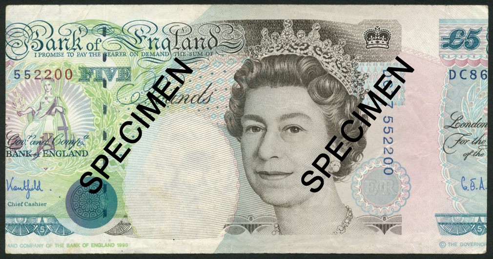 ERROR: Bank of England, G.E.A Kentfield, £5, ND (1993), serial number DC77 552200, multicolour, Elizabeth II at right, Britannia at left, reverse blue, George Stevenson at right, rocket at left, major miscut with part of note missing, prefix of adjoining note at right