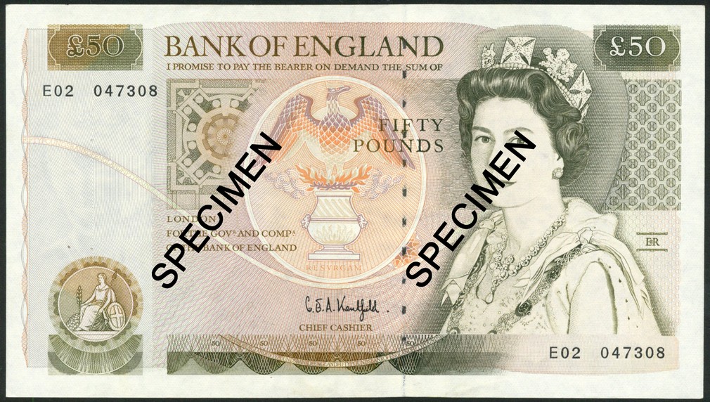 Bank of England, G.E.A Kentfield, a group comprising a consecutive pair £50, ND (1991), prefix E02, £5, ND (1993), prefixes AA01 and AK34, £10, ND (1992), prefixes A01 (3), £20, ND (1994), prefixes AJ15 and BA26