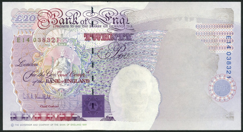 ERROR: Bank of England, G.E.A.Kentfield, £20, ND (1991), serial number E14 038321, blue and purple, Elizabeth II and other darker printing missing/extremely light at right, Britannia at left, reverse Hardy at right