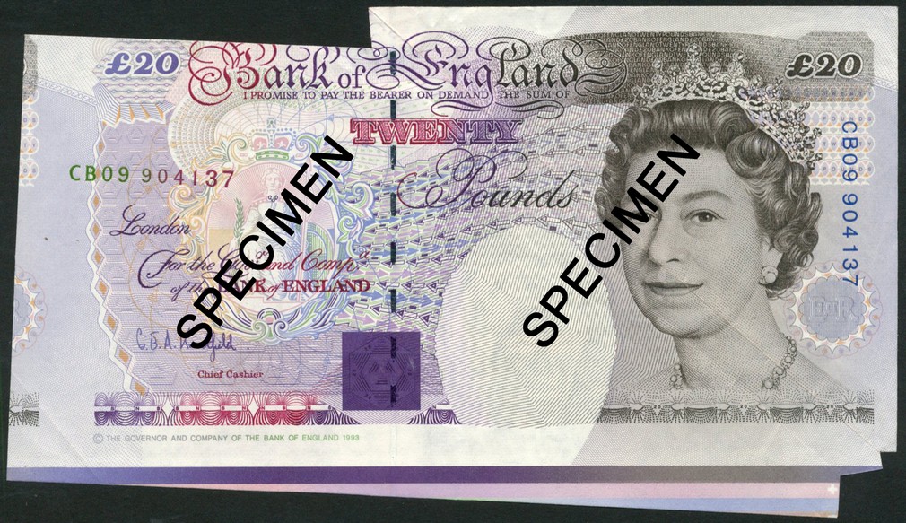 ERROR: Bank of England, G.E.A. Kentfield £20, ND (1994), serial number CB09 904137 purple with Elizabeth II at right, reverse purple and multicoloured, Michael Farady at right, miscut with part of note missing at top and colour bars at low